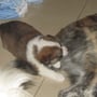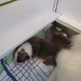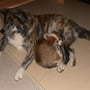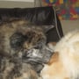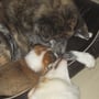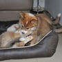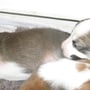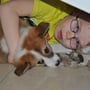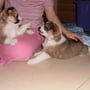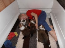 Mit dem wachsenden Bewegungsdrang und den neu entdeckten Sinnen wurde es im Geburtsraum zu langweilig und ruhig, sodaß wir die Kleinen in unser Wohnzimmer siedelten. Hier bekommen sie alles mit, was bei uns so im Laufe des Tages passiert und der Grundstein für eine optimale Sozialisierung wird gelegt. Vorallem Tobias übernimmt nun viele Betreuungs - und Kuscheleinheiten!