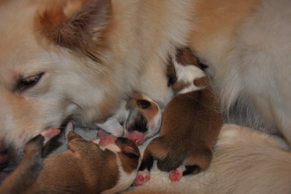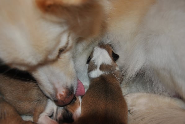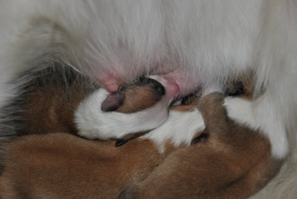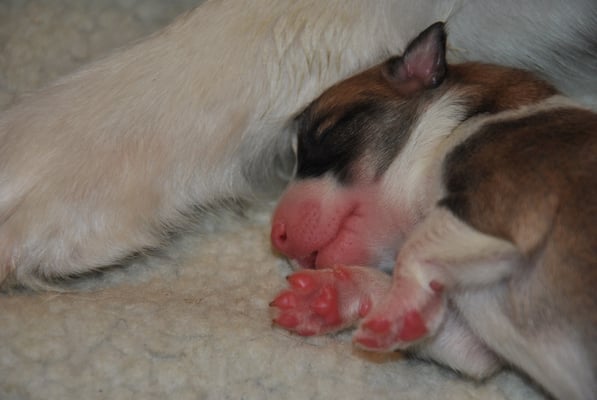 Die ersten Lebenstage der Welpen vergingen ruhig, gelassen und stressfrei. Duna ist ein liebvolle, sorgsame Mutter die ihre Kleinen kaum aus den Augen lässt. Die Welpen sind im Laufe der Woche zu kleinen Speckmäusen angewachsen und zwei von ihnen haben ihr Geburtsgewicht bereits verdoppelt. Die Bande ist sehr zufrieden und es gibt kaum Unruhe in der Wurfbox.
